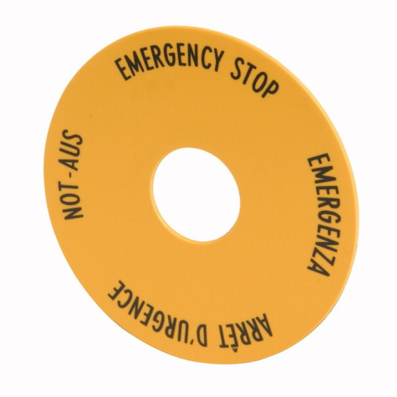 216483 M22-XBK1 Étiquette, arrêt d'urgence, jaune, D=60mm, 4 langues, DE, EN, FR